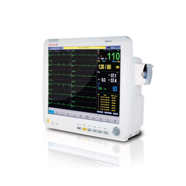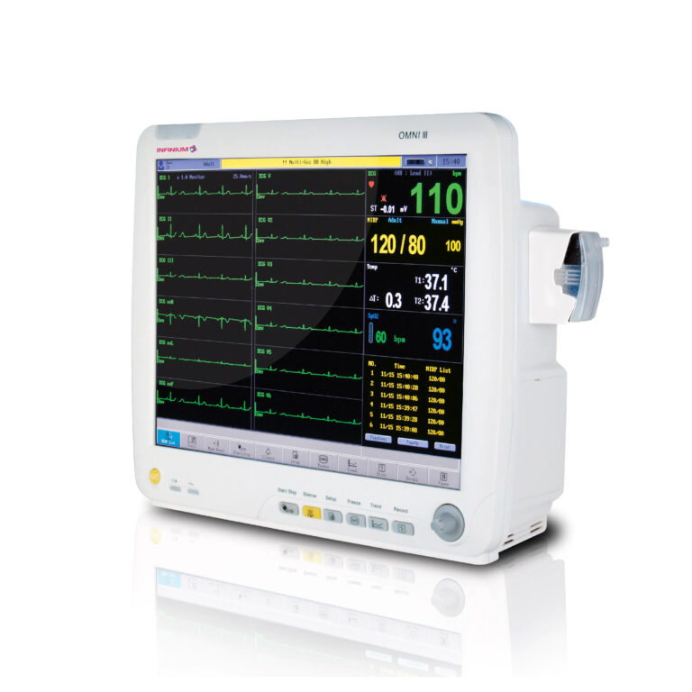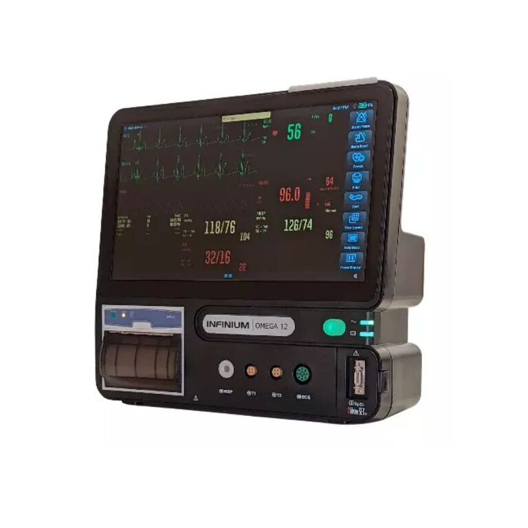 Монітор нового покоління. Медичний 12,5-дюймовий монітор пацієнта OMEGA 12 призначений для моніторингу, запису багатьох фізіологічних параметрів дорослих, дітей та новонароджених. Критичні фізіологічні параметри включають ЕКГ (електрокардіограма), частоту серцевих скорочень (HR), пульсове насичення киснем (SpO2), частоту пульсу (PR), неінвазивний артеріальний тиск (NIBP), частоту дихання (RR), температуру (Temp), інвазивний АТ (IBP), серцевий викид (CO). Крім того, опційно можна відстежувати показник капнографії (EtCO2) і біспектральний індекс (BIS) за допомогою додаткового модуля. Вимірювання можна відображати, переглядати на екрані, зберігати та друкувати.