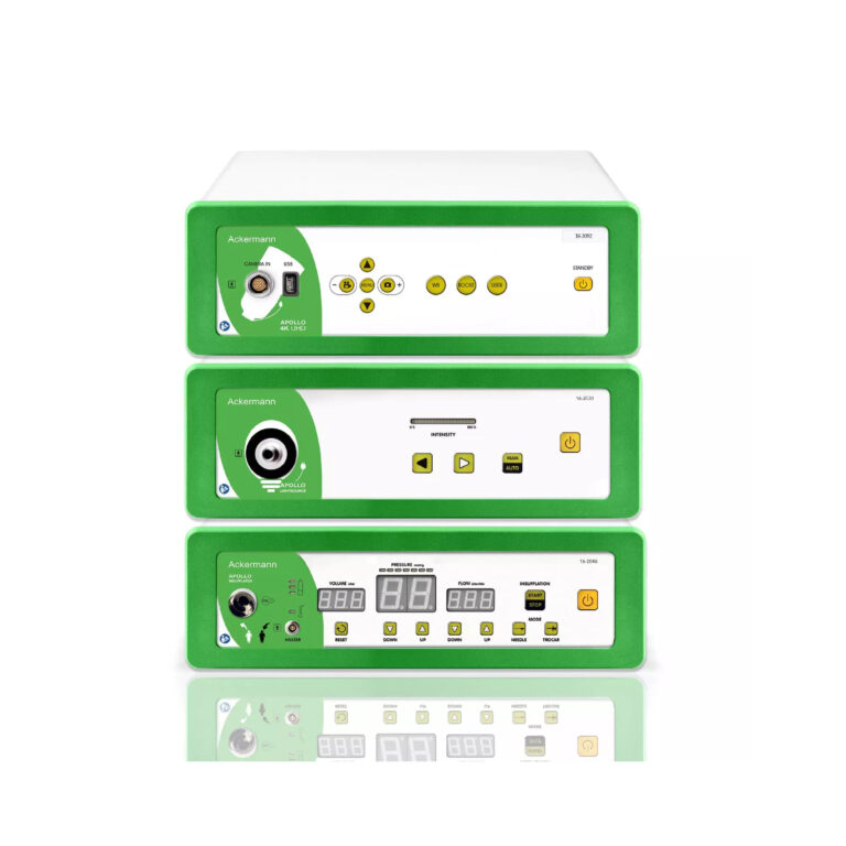 ACKERMANN APOLLO™ - це високоякісна система ендоскопічної візуалізації на базі 3-ох чіпової камери з роздільною здатністю 4К. Комплексне рішення включає ендоскопічну камеру з блоком керування, високоякісне LED джерело світла та інсуфлятор.